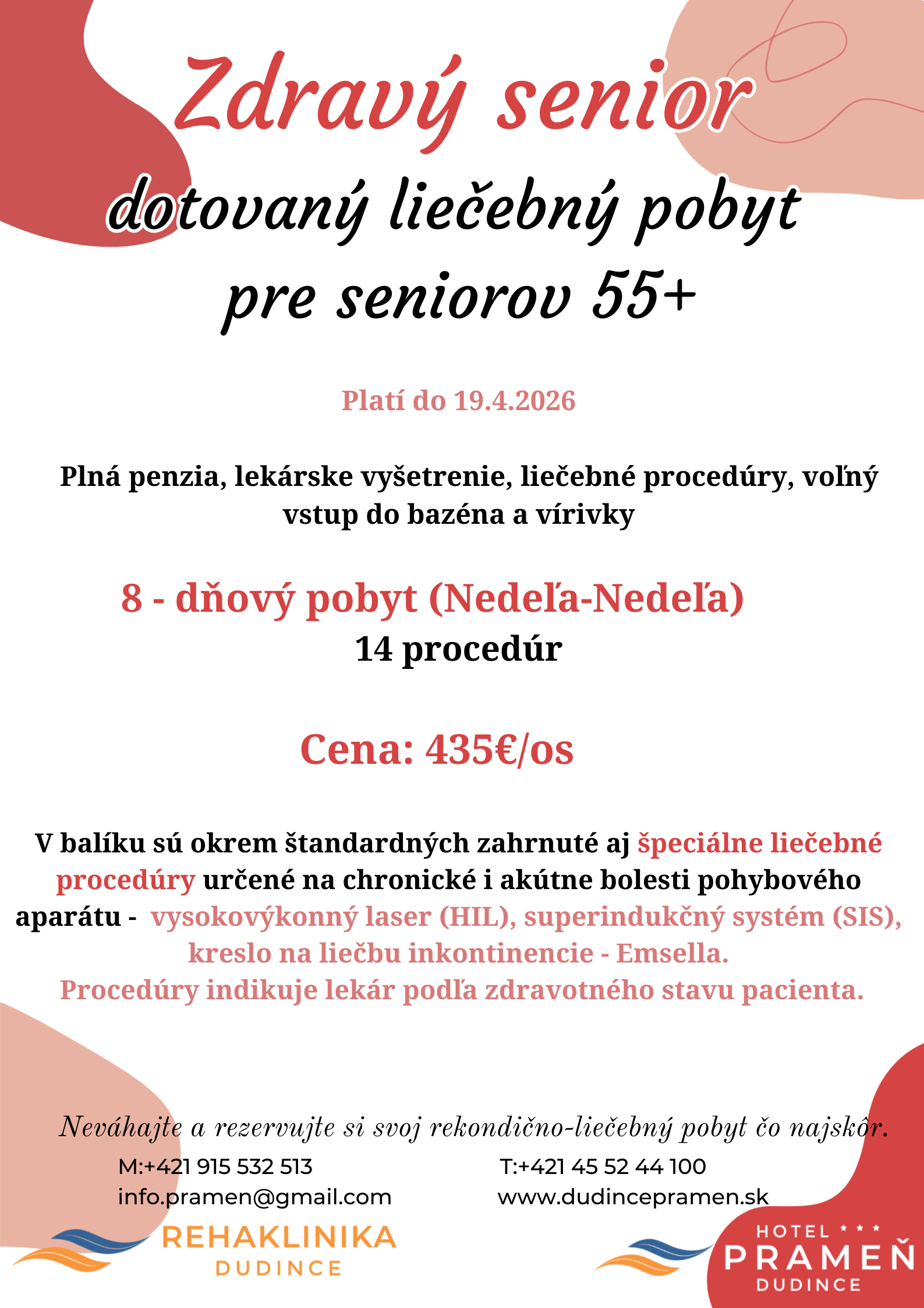 • lekárske vyšetrenie + 12/14 liečebných procedúr – špeciálne procedúry laser HIL a superindukčný systém SIS + štandardné procedúry ako elektroliečba, termoterapia, masáže, morský kúpeľ, vodoliečba, individuálna terapia, cvičenie v bazéne